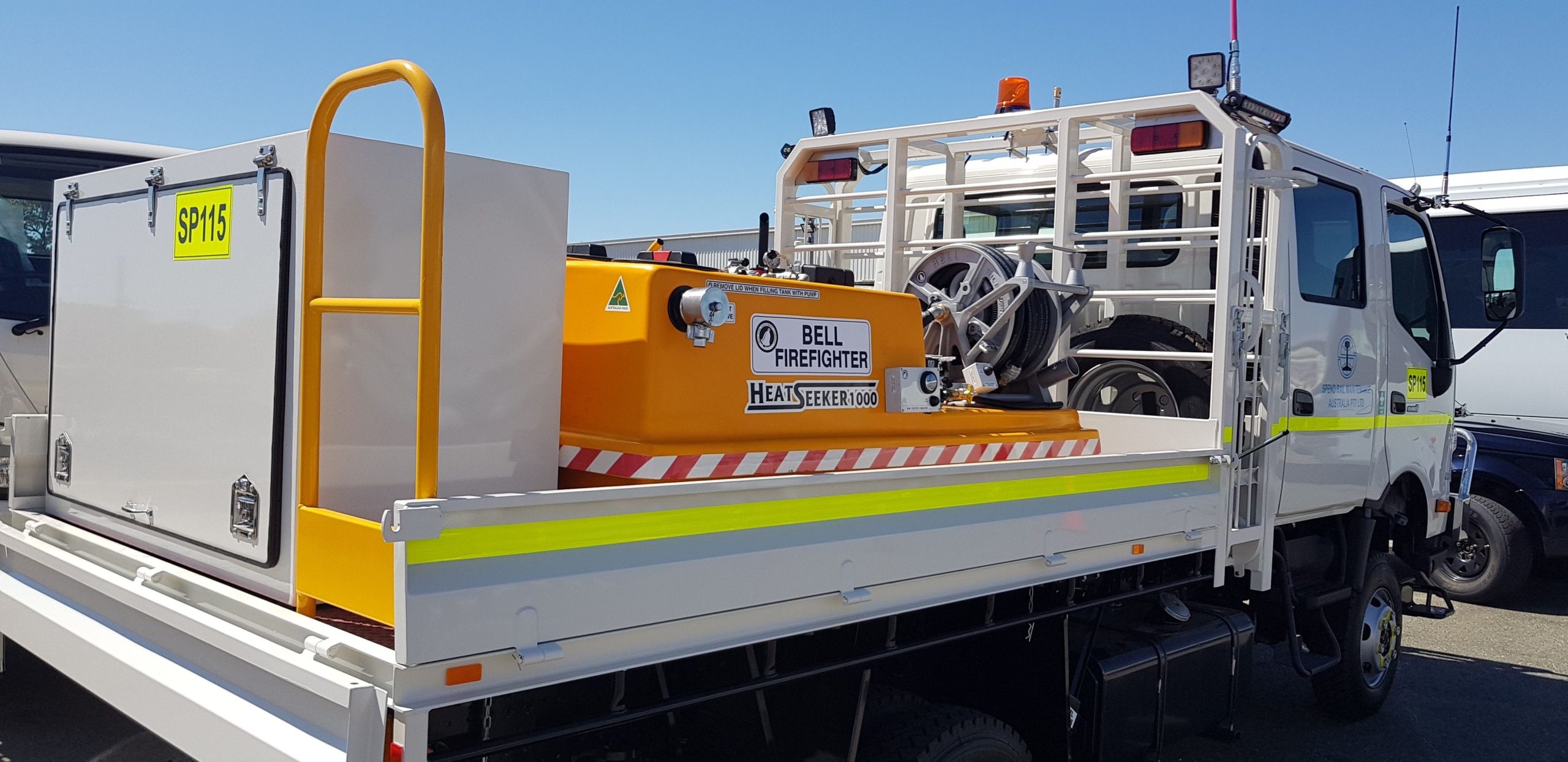 BELL FIREFIGHTER Heavy duty series of portable slip-on style “Firefighters” are manufactured in the traditional way with all operational components, equipment lockers and a BELLGLASS fully baffled fibreglass tank fitted to a heavy-duty galvanised steel base frame.